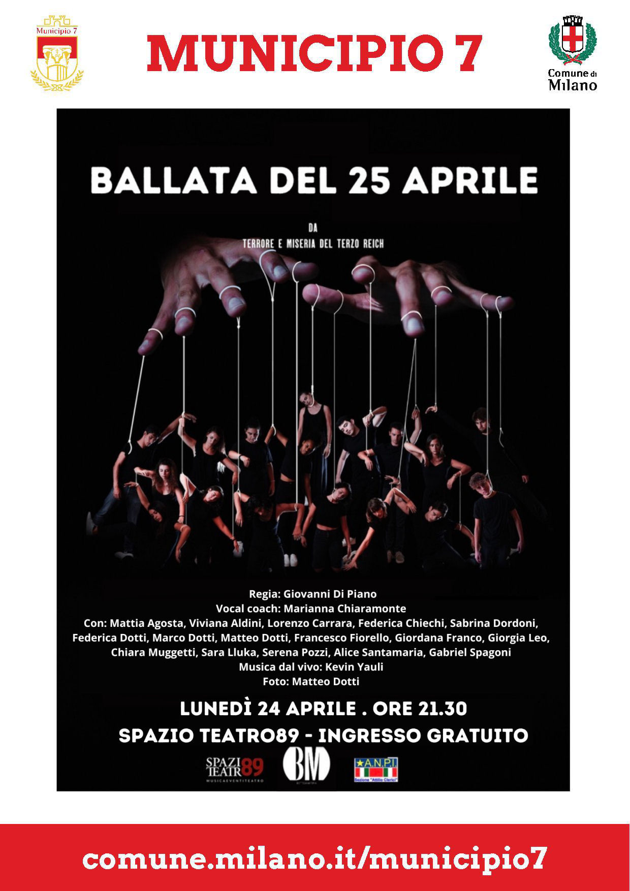- “Ballata del 25 aprile” liberamente tratto da: “Terrore e miseria del Terzo Reich” di Bertolt Brecht, scene flash, rapidi scorci, feroci e agghiaccianti insieme ad altre scene più diffuse e discorsive. La paura contagia tutti, intellettuali, scienziati, medici, giudici ma anche operai, bottegai, domestici, soldati, colpisce ovunque. Classi sociali diverse in reazione all’oppressione crescente in un meccanismo drammaturgico serrato. La rappresentazione si terrà presso il Teatro SpazioTeatro89 in via Fratelli Zoia 89 il 24 aprile 2023, alle ore 21:00.
