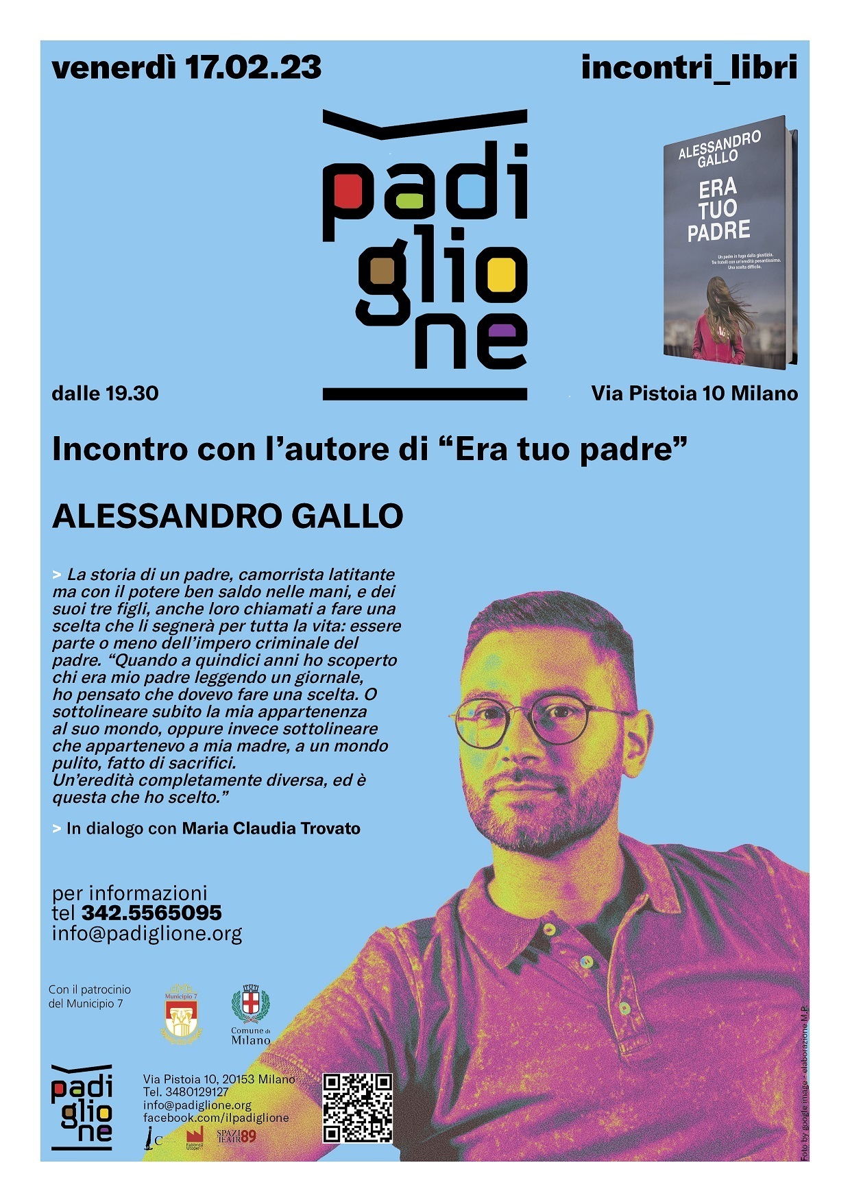 L’associazione Compagnia Carnevale con il patrocinio del Municipio 7 nell’ambito dell’iniziativa “Libri di Padiglione” vi invita a partecipare all’incontro con l’autore di “Era tuo padre”, Alessandro Gallo, venerdì 17 febbraio alle ore 19:30, presso il Padiglione di via Pistoia n. 10.