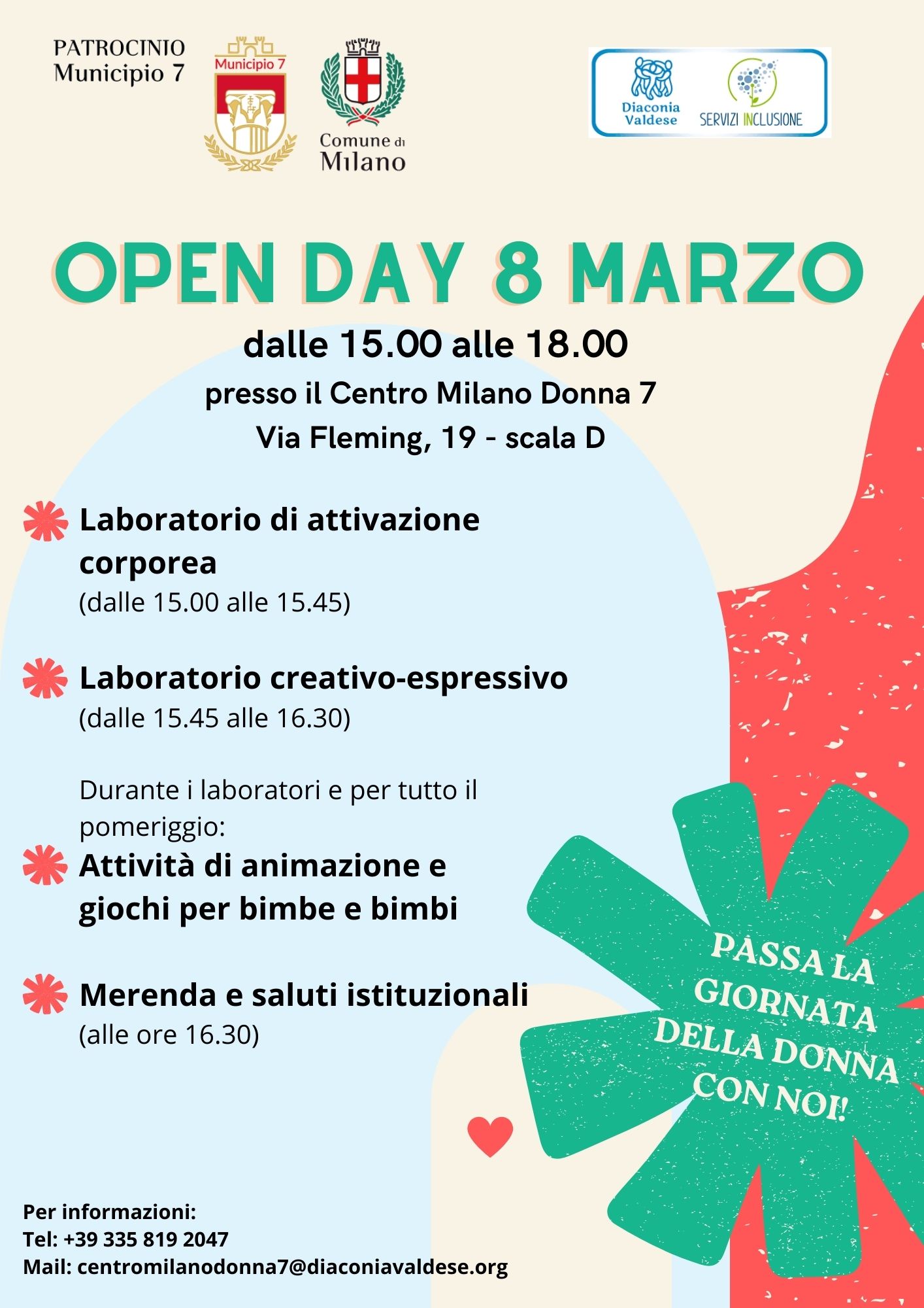 Durante l’open day dell’otto marzo, patrocinato e organizzato con le istituzioni e l’amministrazione del Municipio 7 di Milano, sarà possibile partecipare dalle 15:00, ad un laboratorio di attivazione corporea mentre dalle 15:45 sarà la volta di un laboratorio creativo-espressivo.