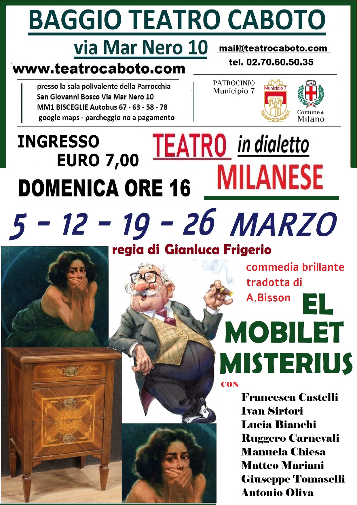L’associazione Teatri Milano Hic Et Nunc con il patrocinio del Municipio 7 organizza l’iniziativa “Rassegna teatro in lingua milanese anno 2023” a partire dal mese di marzo fino al mese di dicembre 2023, presso la Sala Baggio Teatro Caboto in via Mar Nero 10.