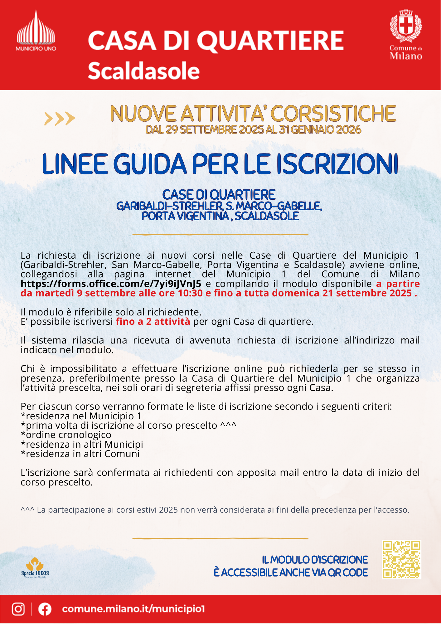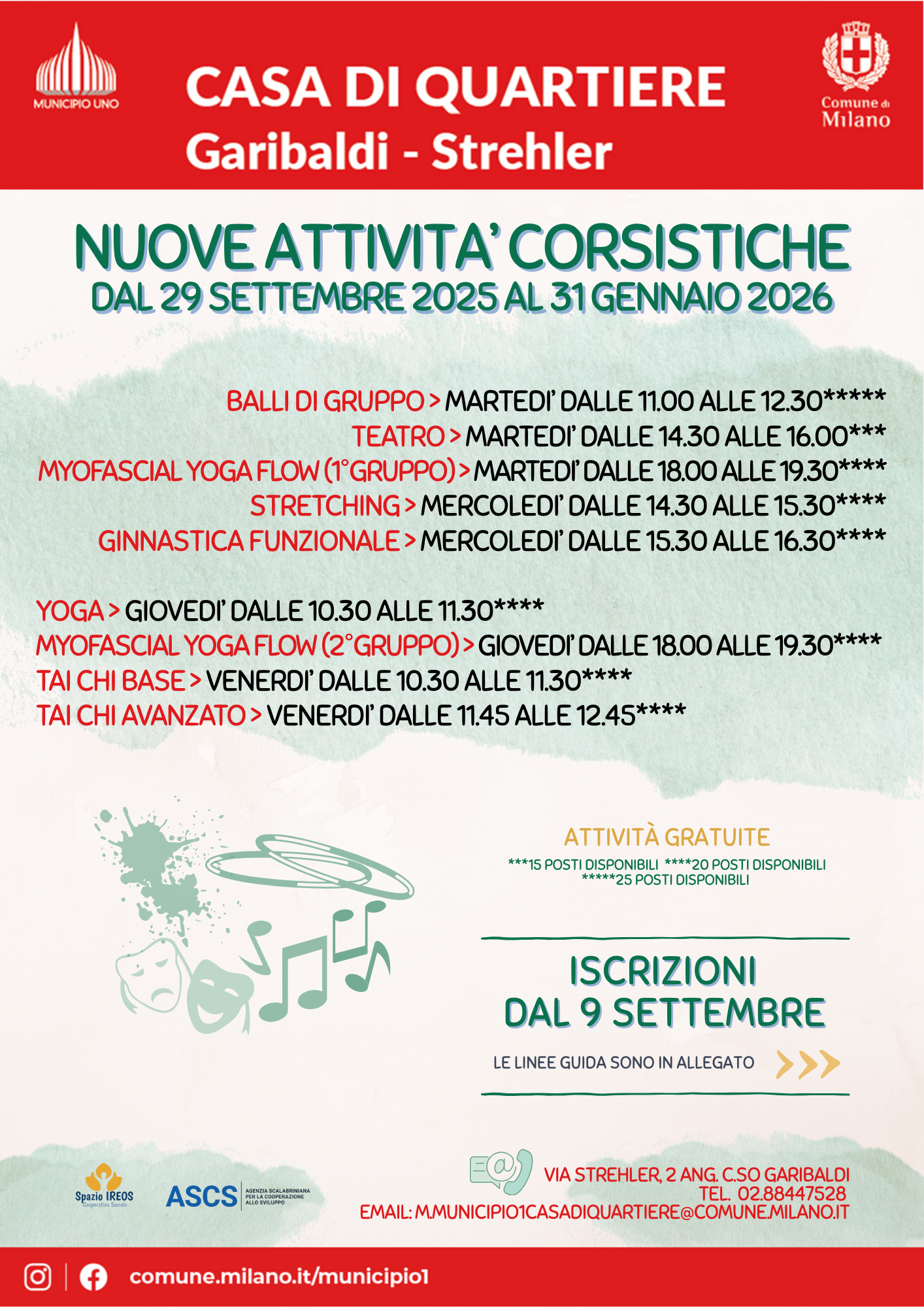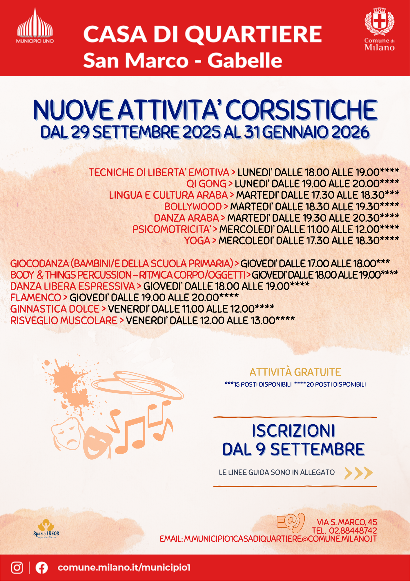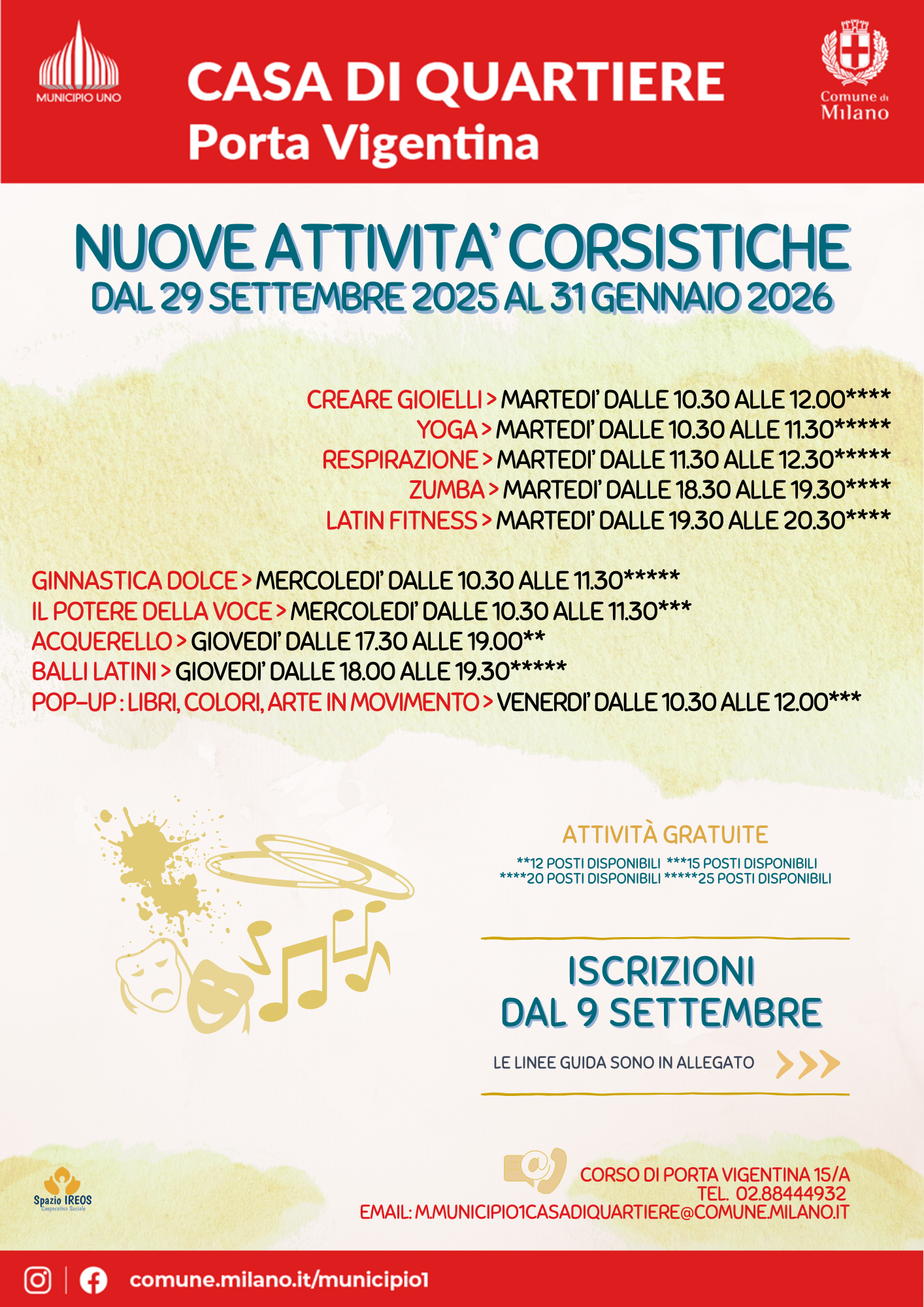 A partire dalle ore 10:30 di martedì 9 settembre sino alle ore 23:59 di domenica 21 settembre è possibile iscriversi alle attività proposte nelle Case di Quartiere del Municipio 1.