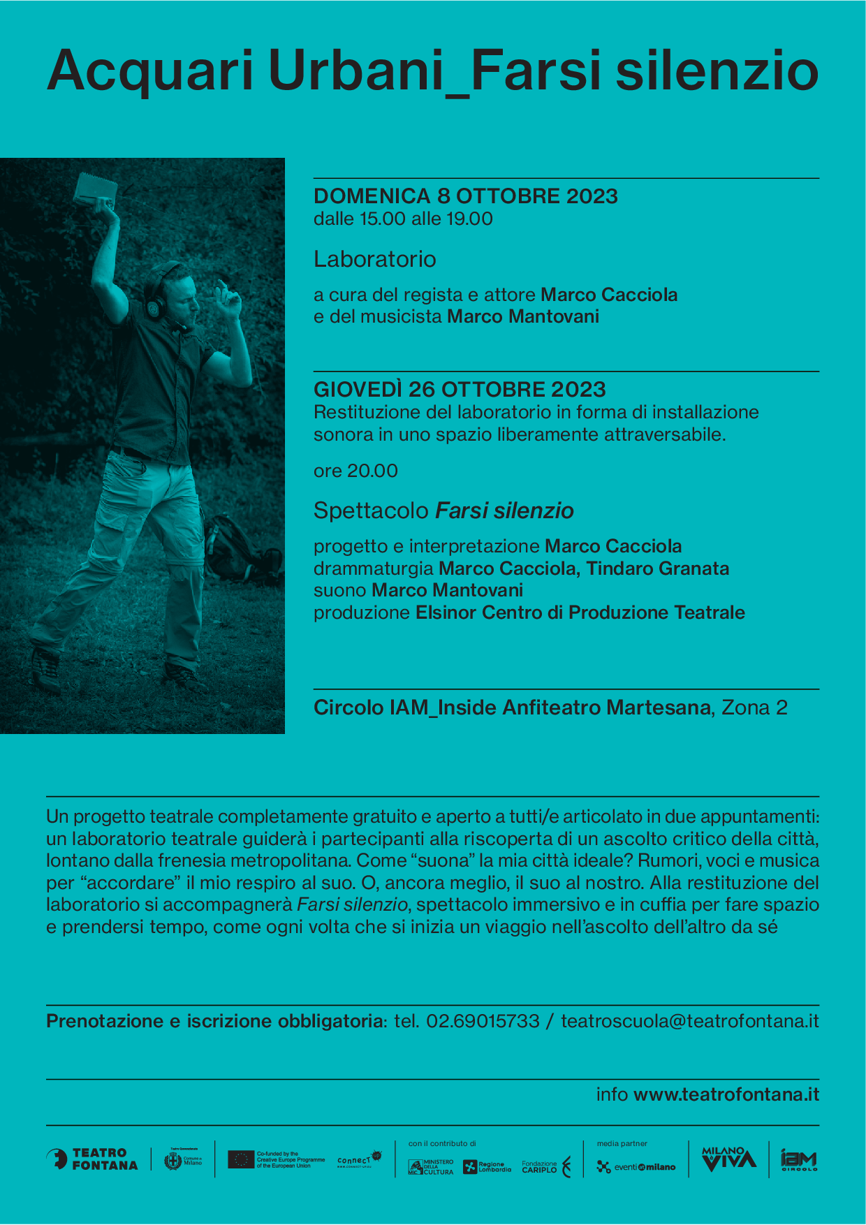Si tratta infatti di un progetto teatrale completamente gratuito e aperto a tutti/e, articolato in due appuntamenti: un laboratorio, a cura dell’attore e regista Marco Cacciola e del musicista Marco Mantovani, guiderà i partecipanti alla riscoperta di un ascolto critico della città, lontano dalla frenesia metropolitana. Alla restituzione del laboratorio si accompagnerà Farsi silenzio, spettacolo immersivo e in cuffia per fare spazio e prendersi tempo, come ogni volta che si inizia un viaggio nell'ascolto dell'altro da sé, di e con Marco Cacciola, Tindaro Granata, Marco Mantovani.