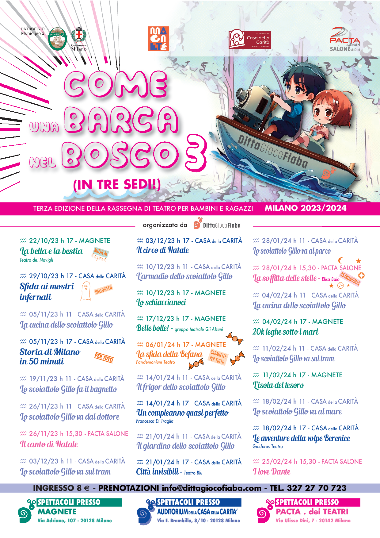 Milano, 13 ottobre 2023 - Torna la rassegna teatrale per bambini e ragazzi, che ha riscosso grande successo nelle precedenti edizioni, e che si svolgerà quest'anno in tre sedi sul territorio del Municipio 2: Magnete, via Adriano 107 - Auditorium della Casa della Carità, via F. Brambilla 8/10 - Pacta . dei Teatri, via Ulisse Dini 7.
