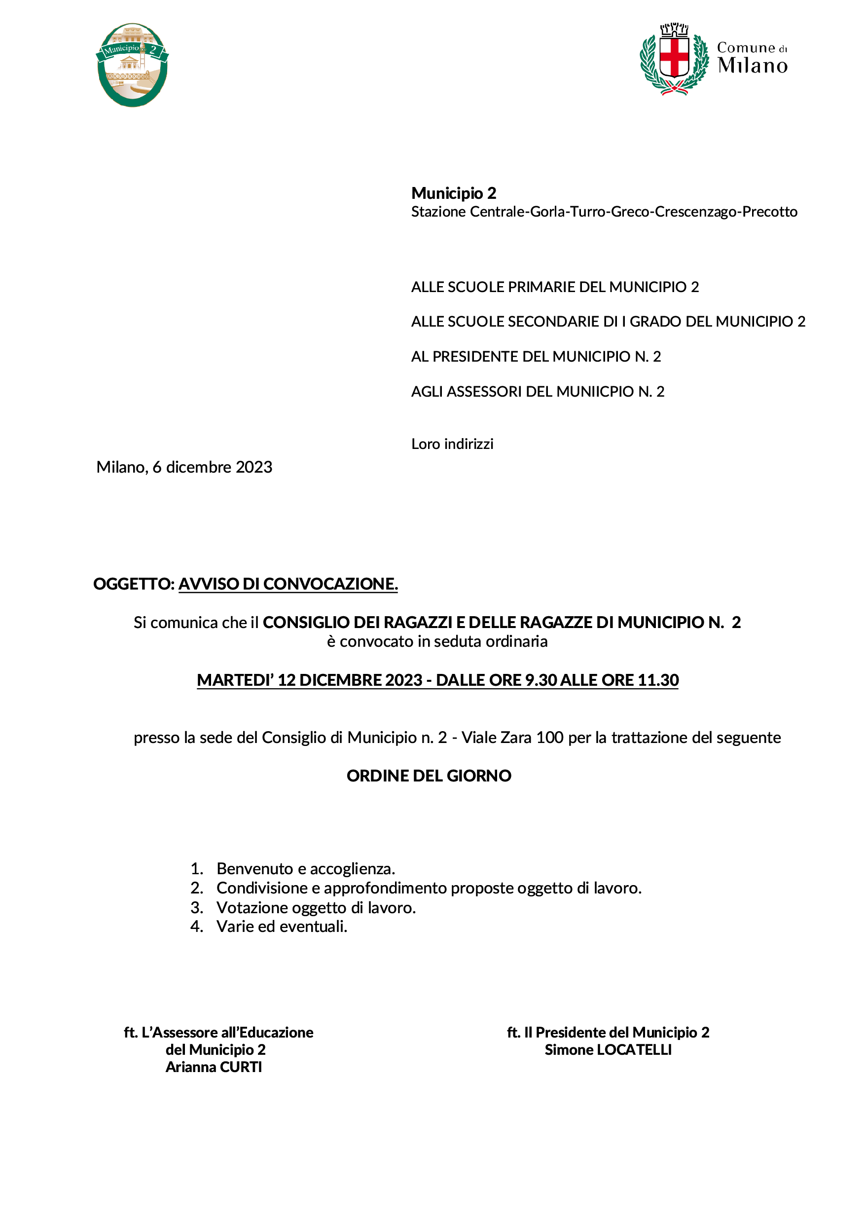 Milano, 07 dicembre 2023 - Il Consiglio dei Ragazzi e delle Ragazze di Municipio 2 è convocato - in seduta ordinaria - per martedì 12 dicembre 2023 dalle 09:30 alle 11:30, presso l'Aula consiliare di viale Zara 100.