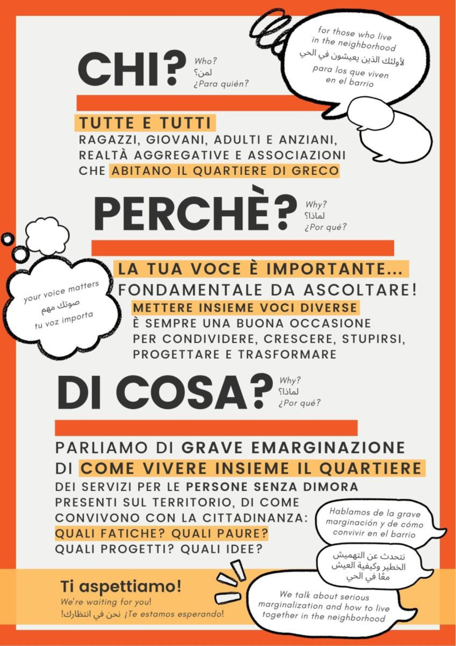 Un confronto partecipato e laboratoriale, partendo dalla presenza nel quartiere dei servizi per le persone senza dimora, per ragazzi, giovani, adulti e anziani, realtà aggregative, associazioni, Enti del Terzo Settore che abitano Greco.