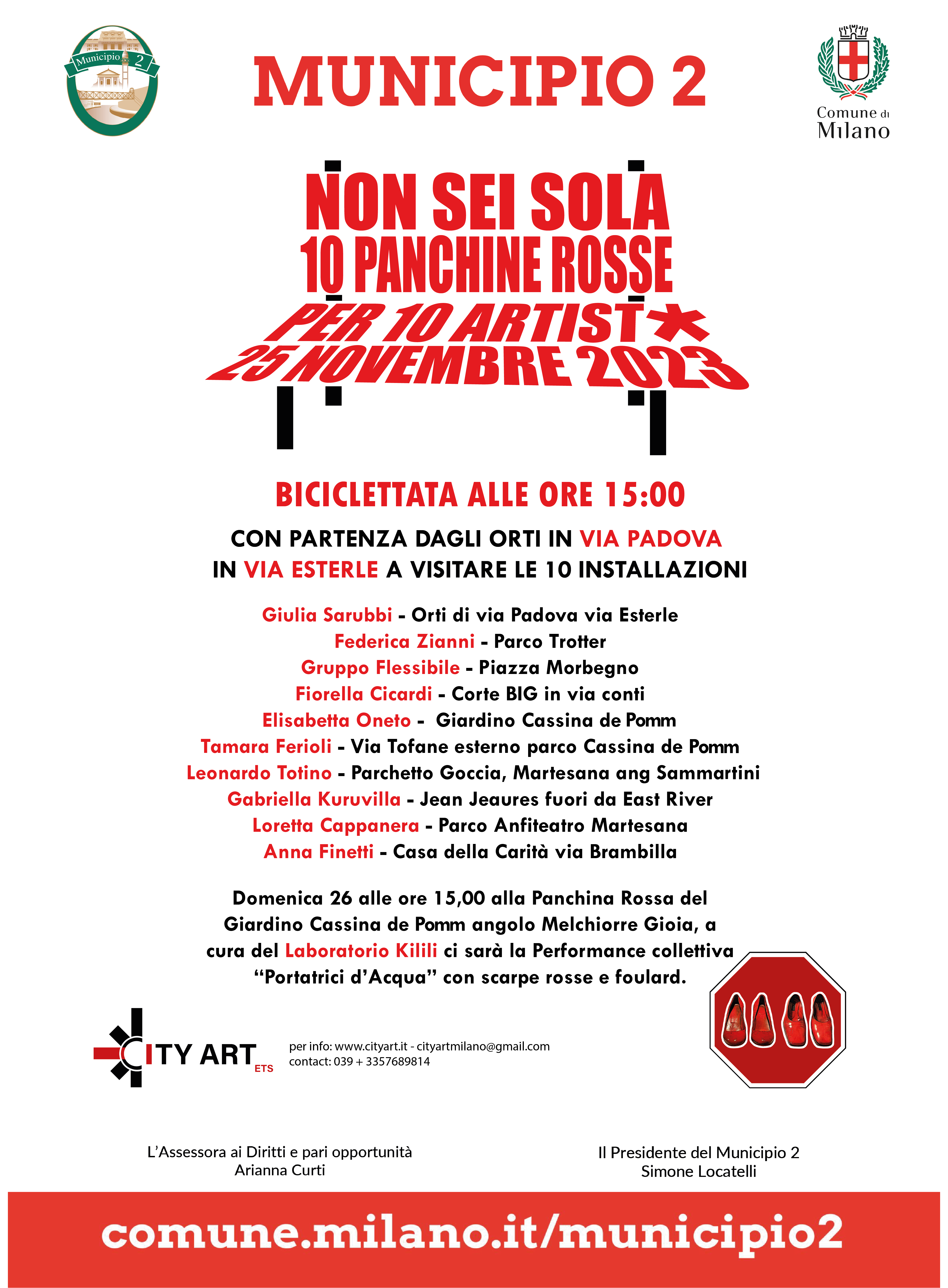 - 25 novembre 2023 alle 15:00, con la collaborazione di City Art, partirà una biciclettata dagli Orti di via Padova in via Esterle, per visitare 10 panchine rosse: