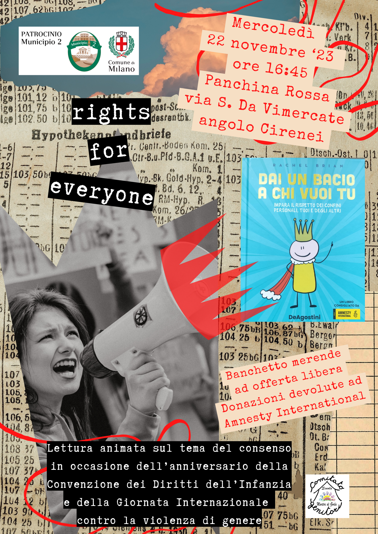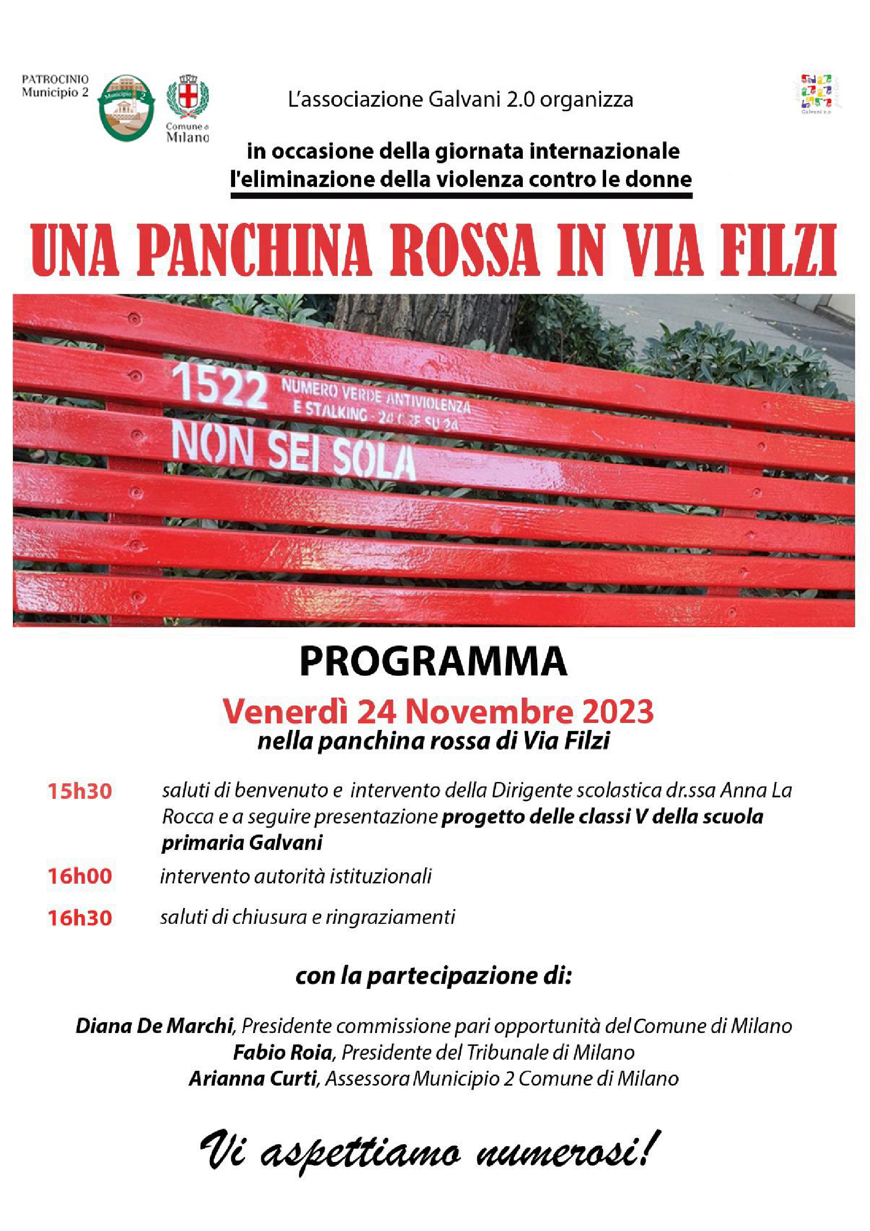- 22 novembre 2023 alle 16:45 presso la panchina rossa di via Stefanardo da Vimercate angolo via Cirenei, una lettura animata rivolta ai bambini per sensibilizzarli sulla prevenzione della violenza di genere, con suggerimenti, letture e attività, e merenda per tutti. Iniziativa realizzata dal Comitato Genitori Martiri di Gorla, col patrocinio del Municipio 2;