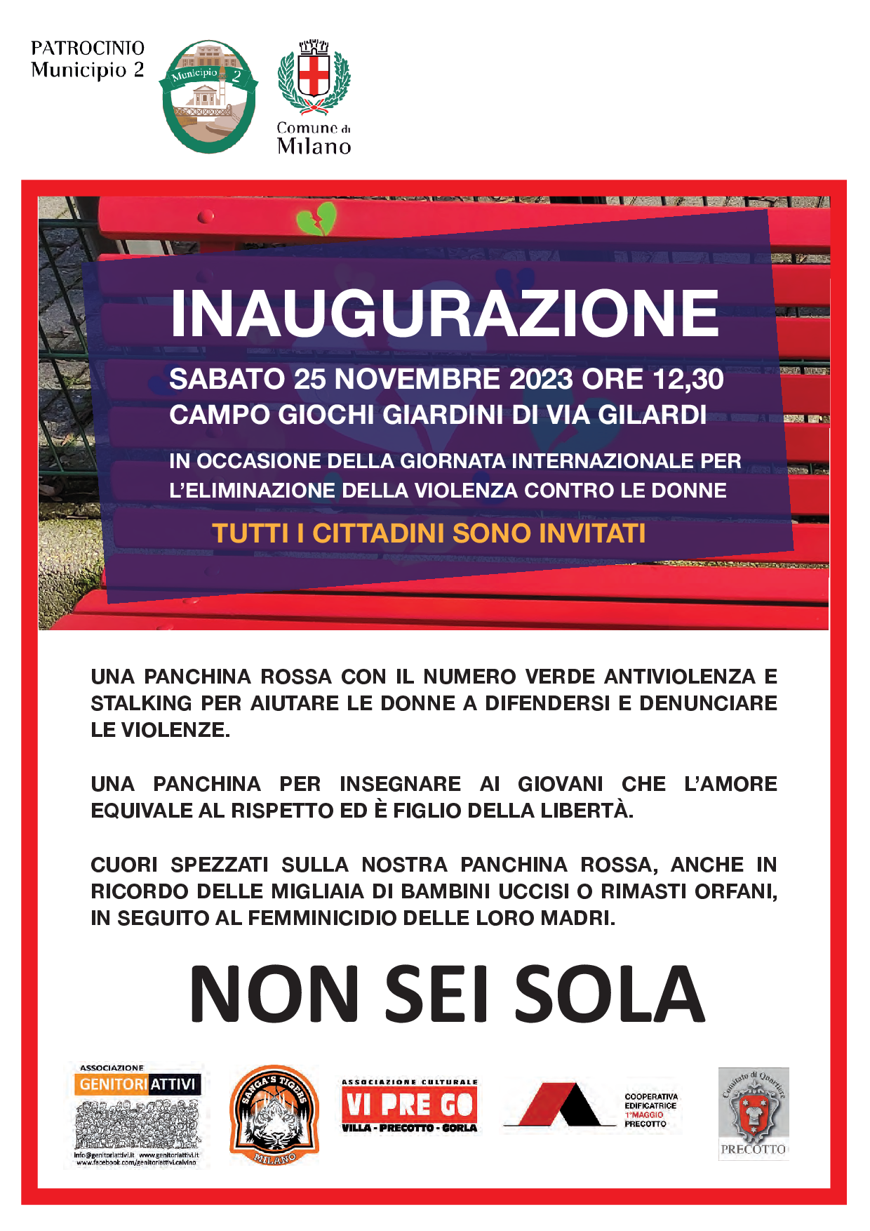 - 25 novembre 2023 alle 12:30 al campo giochi dei giardini di via Gilardi, tutti invitati all'inaugurazione della panchina rossa ridipinta dall'associazione GenitoriAttivi dell'ICS Calvino (via Frigia/Mattei/Sant'Uguzzone/Carnovali/Rucellai), col patrocinio del Municipio 2.