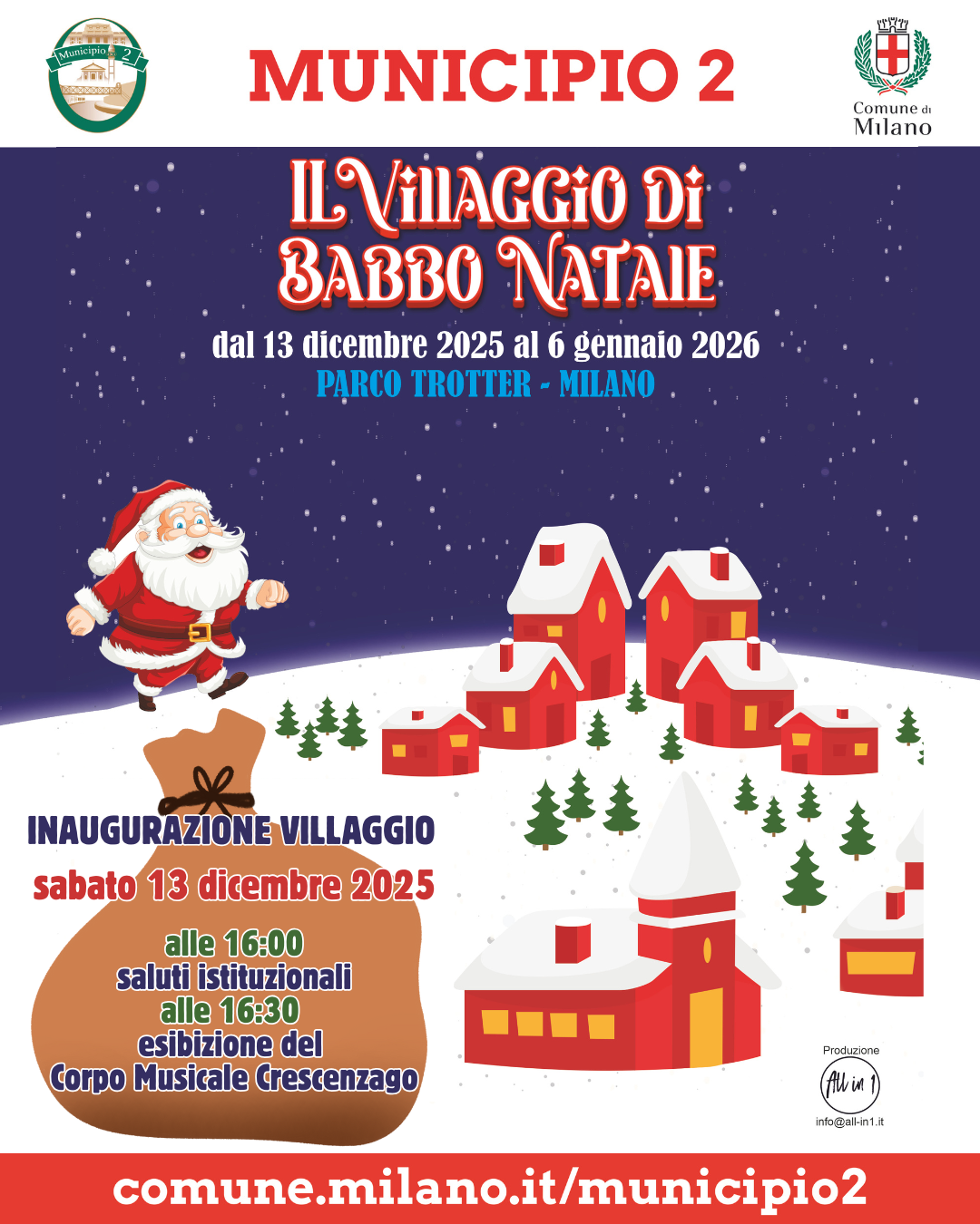 Il Villaggio sarà aperto già dalle 14:00, con dj set, la Baita di Babbo Natale, l'Ufficio Postale del Polo Nord, la Fabbrica degli Elfi e tante attività e spettacoli per tutta la famiglia, che continueranno nei giorni successivi con il programma di seguito indicato, fino all'Epifania 2026: