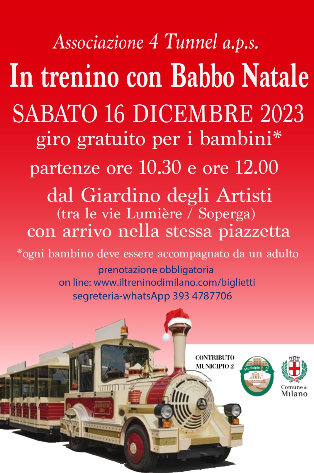 Per il trenino, prenotazione obbligatoria sul sito www.iltreninodimilano.com/biglietti - oppure su whatsapp n. 3934787706