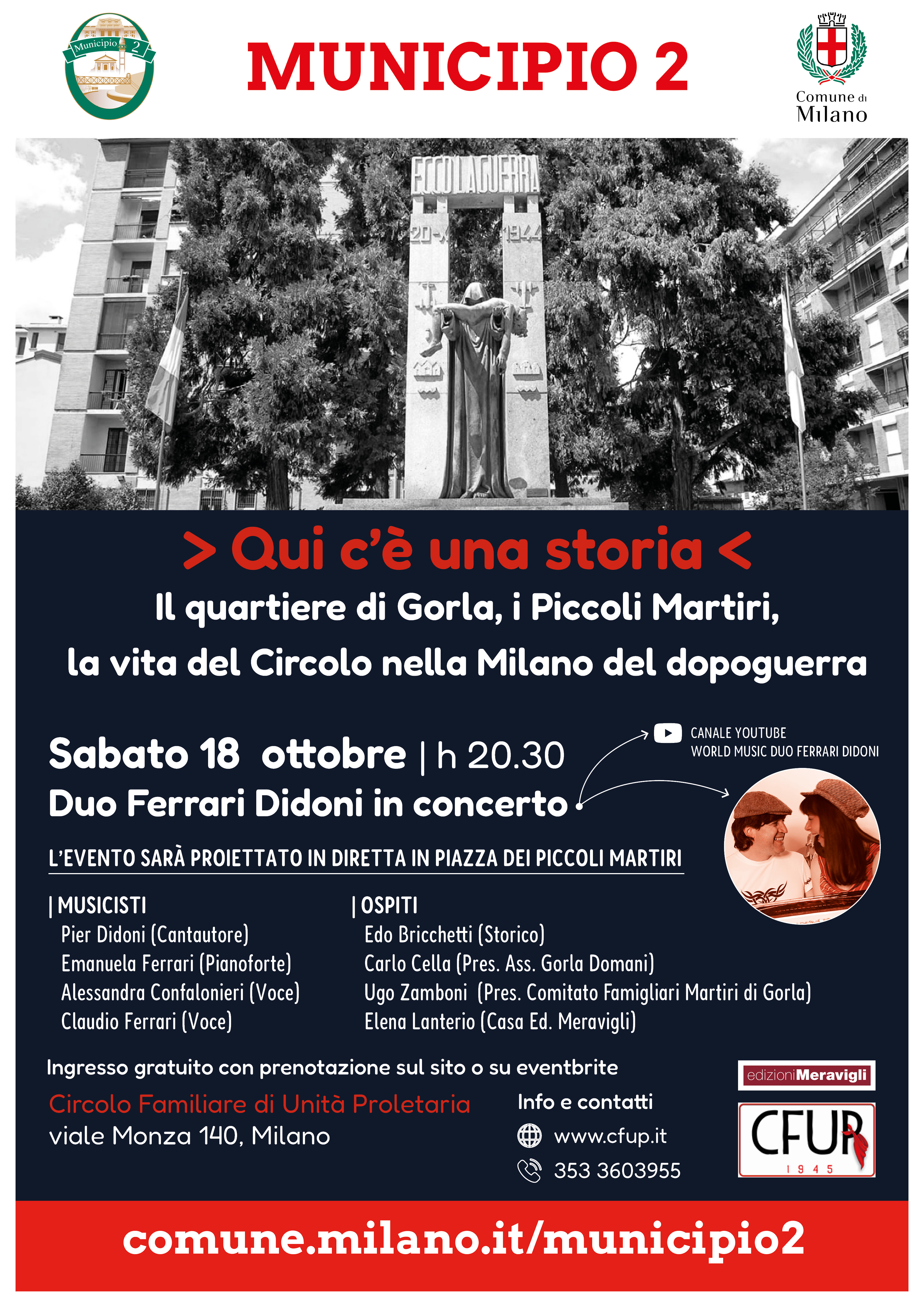 Con i musicisti Pier Didoni - cantautore, Emanuela Ferrari - pianoforte, Alessandra Confalonieri - voce, Claudio Ferrari - Voce e gli ospiti Edo Bricchetti - storico; Carlo Cella - Presidente associazione Gorla Domani, Ugo Zamboni - Presidente Comitato Famigliari Martiri di Gorla, Elena Lanterio - Casa editrice Meravigli.