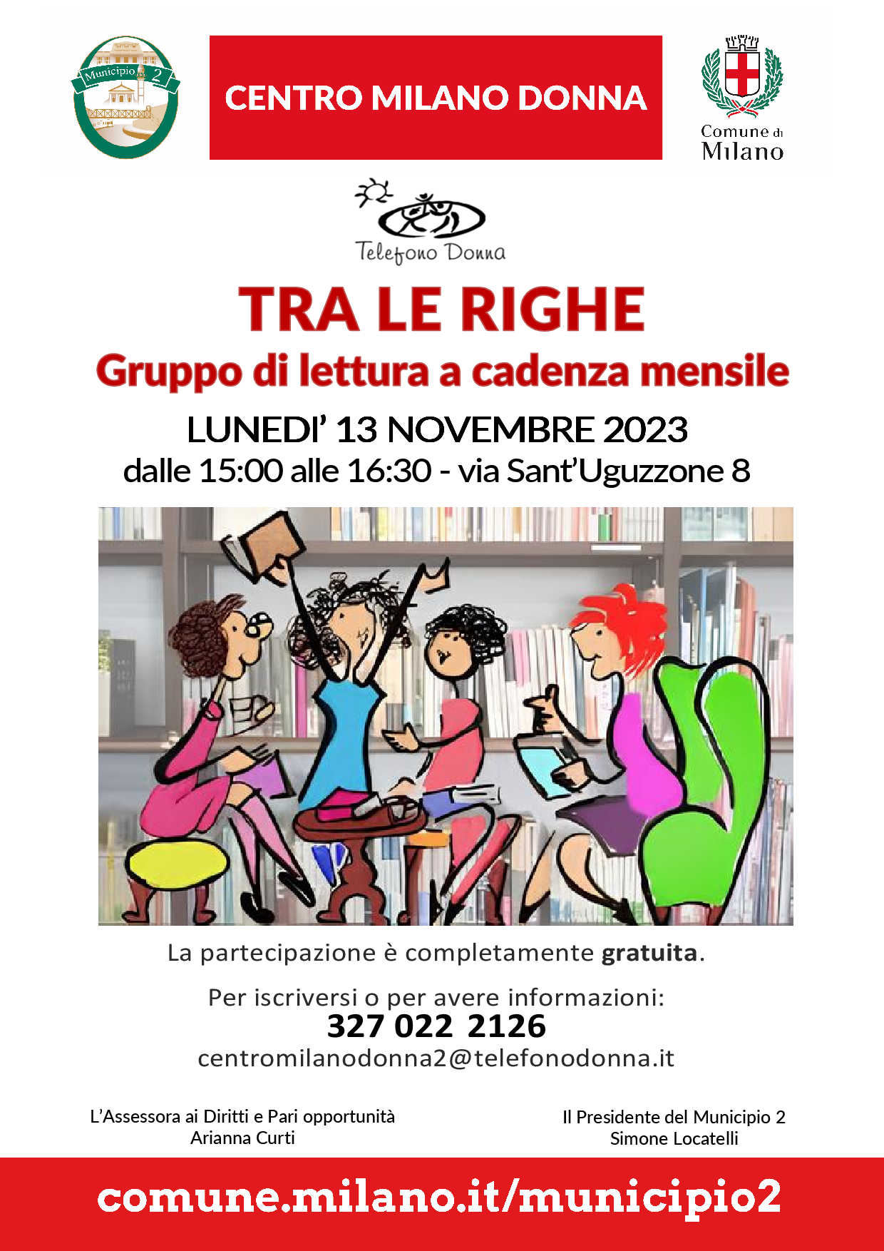 Milano, 24 ottobre 2023 - Parte il 13 novembre 2023 alle 15:00 il nuovo ciclo di incontri di lettura per donne, presso il Centro Milano Donna di via Sant’Uguzzone 8, organizzato a cura di Telefonodonna.