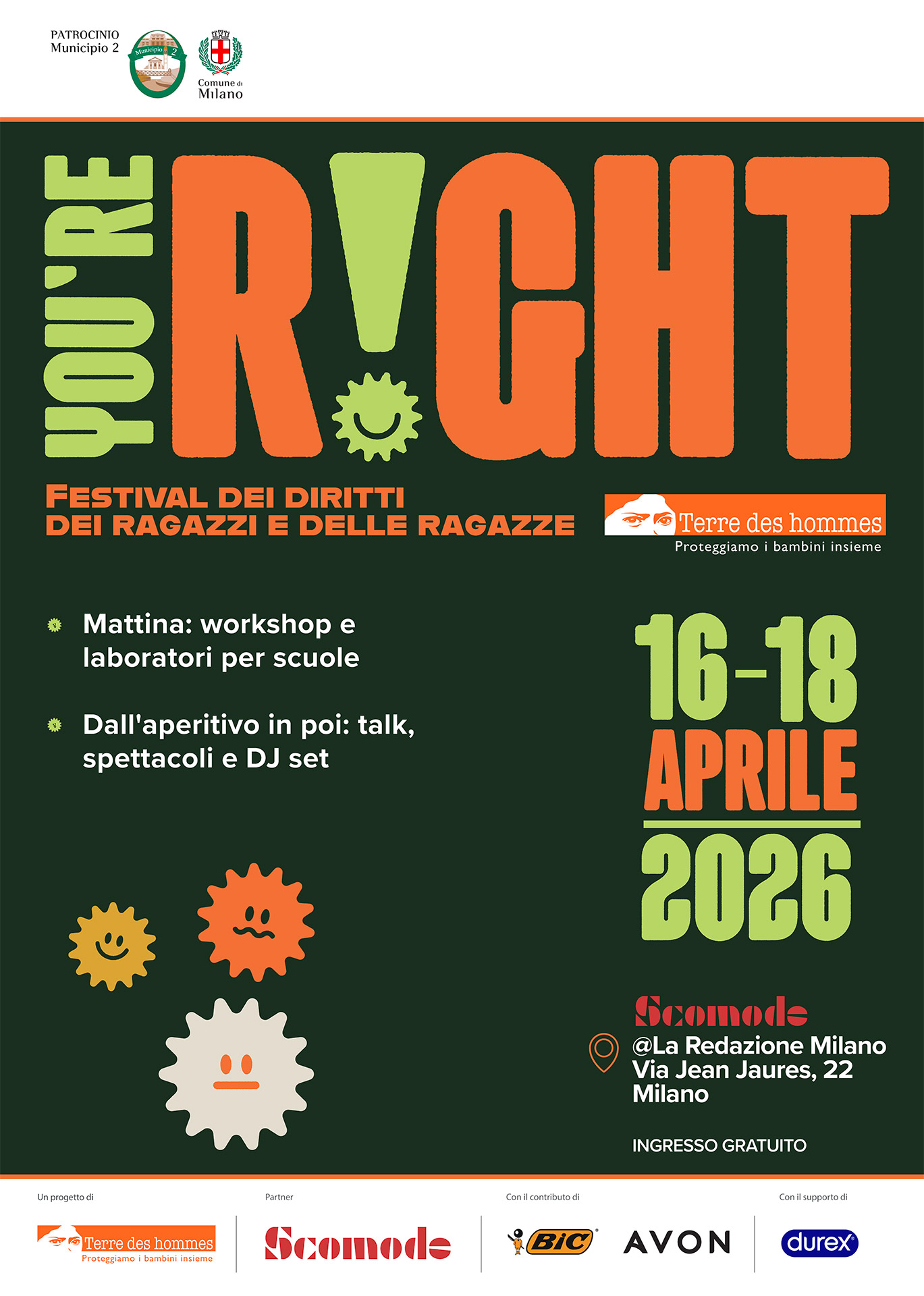 Il Festival si svolgerà dal 16 al 18 aprile 2026 presso Spazio Seacode – La Redazione Milano, via Jean Jaurès 22, e offrirà un programma ricco di attività pensate per coinvolgere ragazze e ragazzi attraverso linguaggi contemporanei, esperienze laboratoriali e momenti di confronto, con l'intento di promuovere una cultura dei diritti, del dialogo e della partecipazione attiva, offrendo alle giovani generazioni uno spazio di espressione e protagonismo.